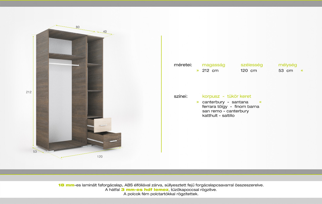 • Színek (korpusz+ajtó / keret+fiók) : canterbury / santana, ferrara tölgy / finom barna, san remo / canterbury, katthult / nero, magyarszilva / nero, calvados / juhar, éger / juhar